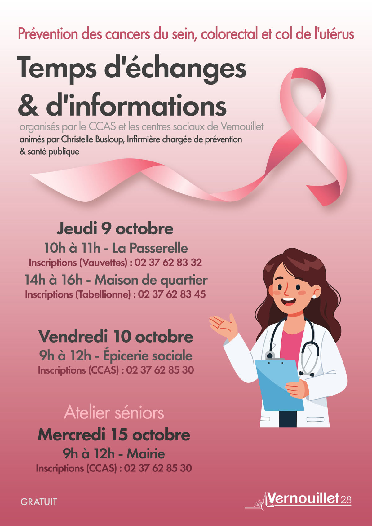 Octobre Rose - Temps d'échanges et d'informations Participez à un temps d'échanges et d'informations sur la prévention des cancers du sein, colorectal et col de l'utérus organisés par le CCAS et les centres sociaux de Vernouillet et animés par Christelle Busloup, Infirmière chargée de prévention & santé publique.