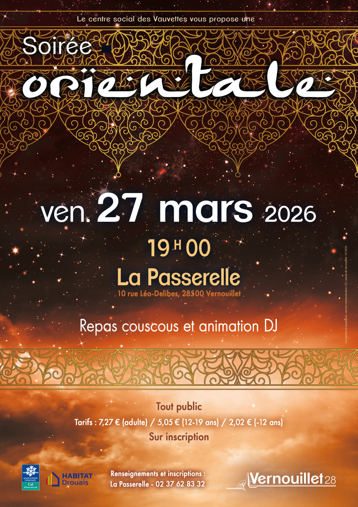 La Ville de Vernouillet vous invite à la Soirée Orientale de vendredi 27 mars 2026 à 19h00, au centre social La Passerelle.