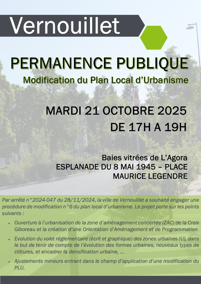 La Ville de Vernouillet vous convie à la permanence publique du mardi 21 octobre dans les baies vitrées de L'Agora dans le cadre de la modification du Plan Local d'Urbanisme. Le projet porte sur les points suivants :
