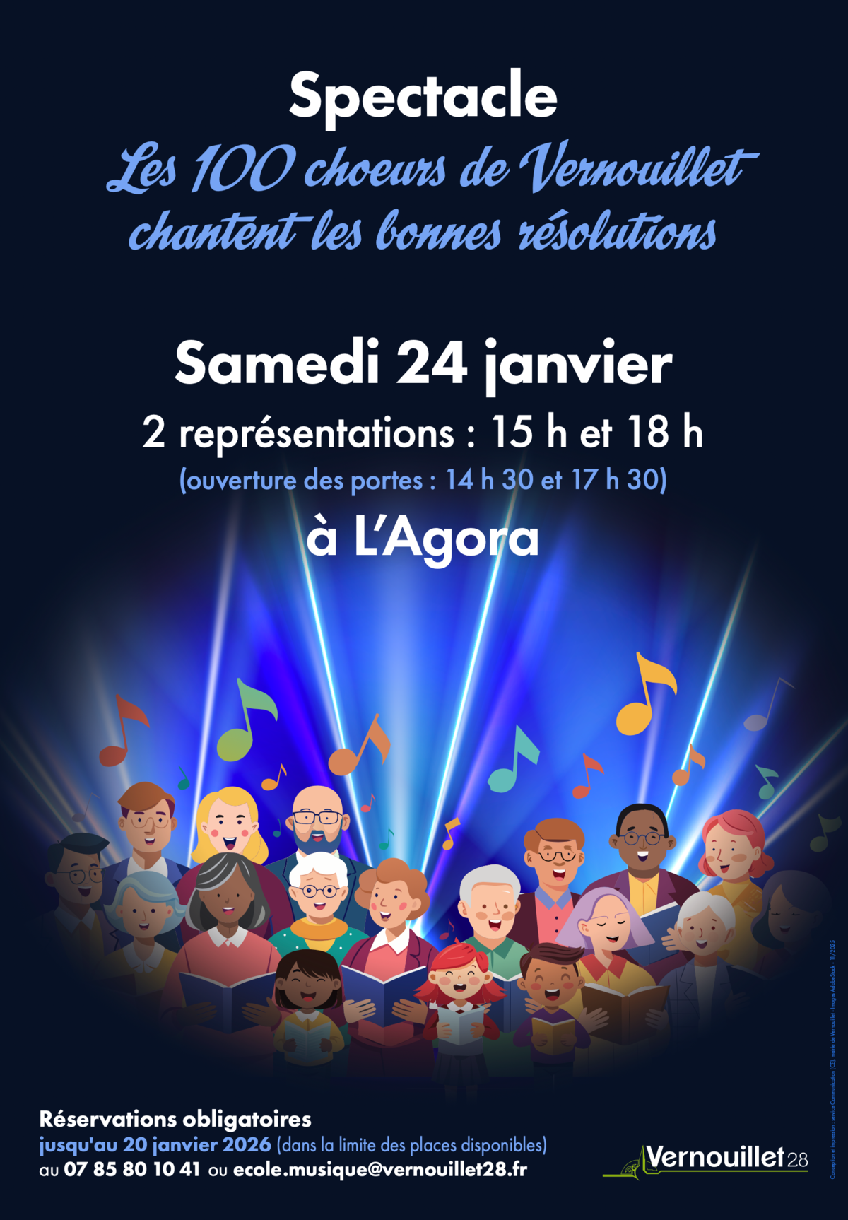 Spectacle P'tites pointes et notesLa Ville de Vernouillet vous convie au Spectacle "Les 100 choeurs de Vernouillet chantent les bonnes résolutions" le samedi 24 janvier à 15h et à 18h (2 représentations) à L'Agora de Vernouillet.