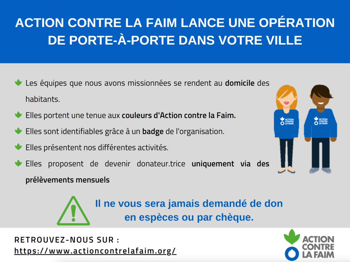 Pendant plusieurs jours, les équipes de l’association se rendent à votre domicile pour leur présenter les actions menées par Action contre la Faim avec pour objectif de gagner de nouveaux soutiens réguliers.