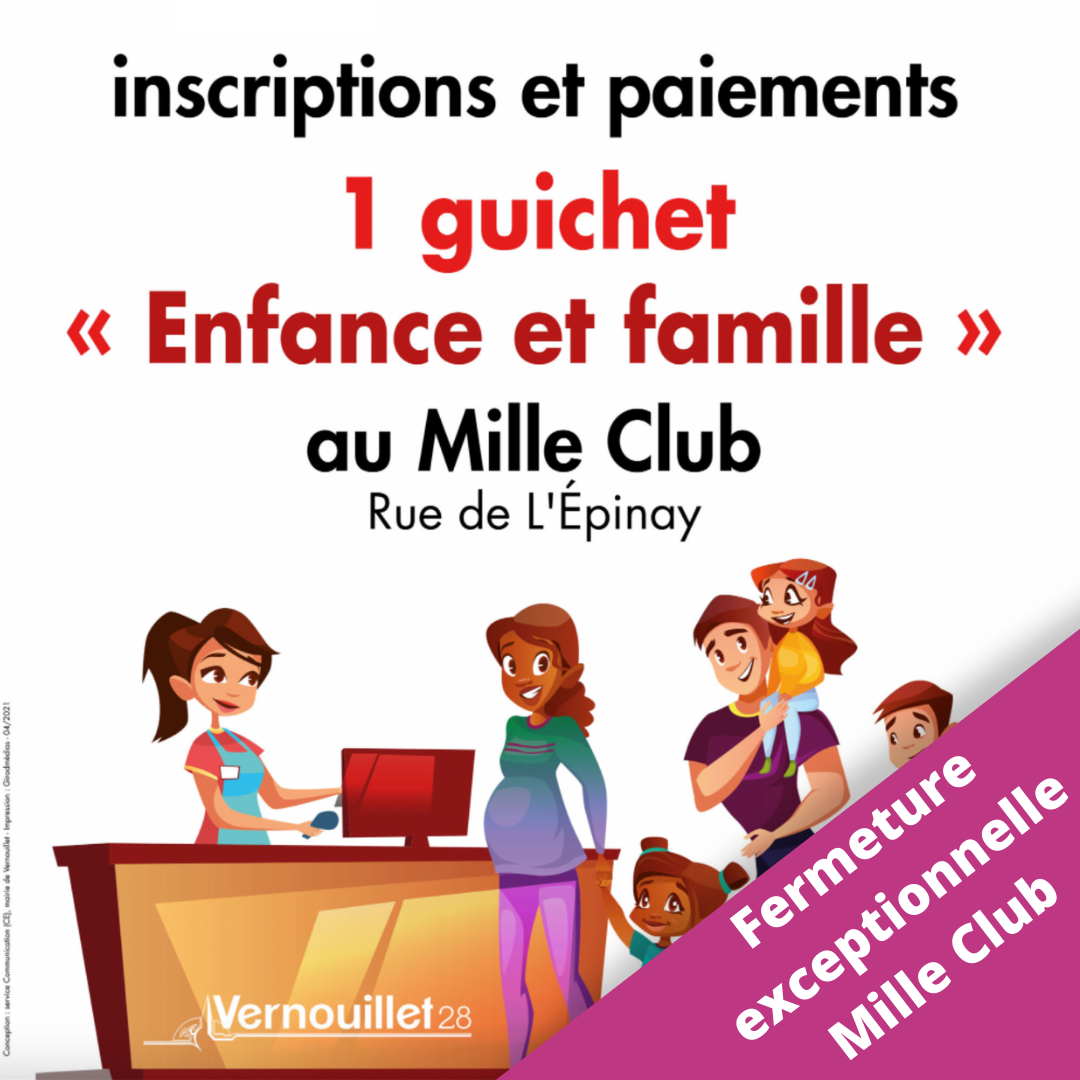Fermeture exceptionnelle du Mille Club et du Pôle FacturationNous vous informons que le Pôle Education Famille - Mille Club sera fermé au public aux dates suivantes, toute la journée :
