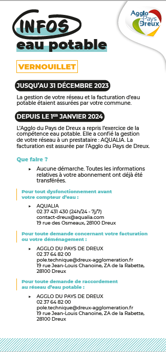 À compter du 2 janvier 2024, le service de l'eau est transféré aux "Services Techniques de l'Agglomération de Dreux".