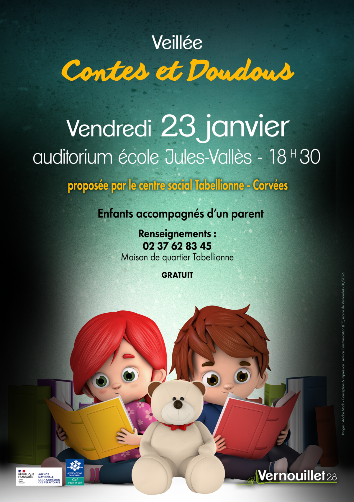 Le Centre Social de la Tabellionne - Corvées organise une soirée Contes & Doudous le Vendredi 23 janvier à 18h30 à l'Auditorium Jules-Vallès.